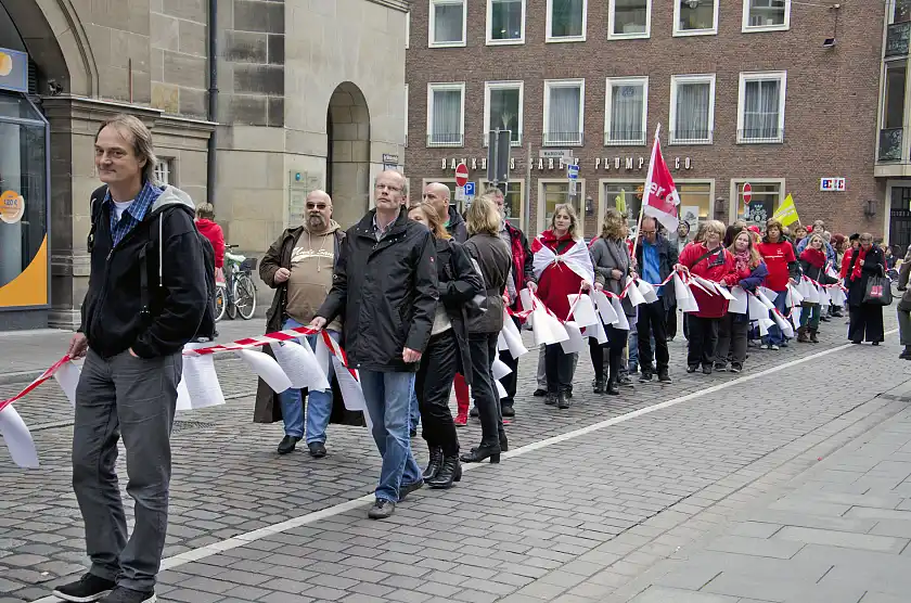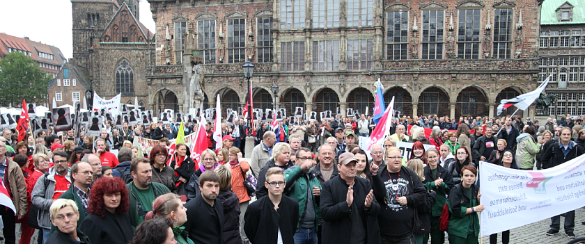 Abgeschlossen wurde die Veranstaltung mit einem Trauerzug rund um die Bremische Bürgerschaft. Angeführt von KollegInnen von Umweltbetrieb Bremen, die das öffentliche Grün zu Grabe trugen, bildeten die TeilnehmerInnen der Kundgebung eine Kette mit 4.000 Unterschriften gegen die Kürzungspolitik. Die Unterschriften wurden den Fraktionsvorsitzenden von SPD und Grünen/Bündnis 90, Björn Tschöpe und Matthias Güldner übergeben. Sie wurden damit aufgefordert, für gute öffentliche Dienstleistungen und ein gerechtes Bremen einzutreten.