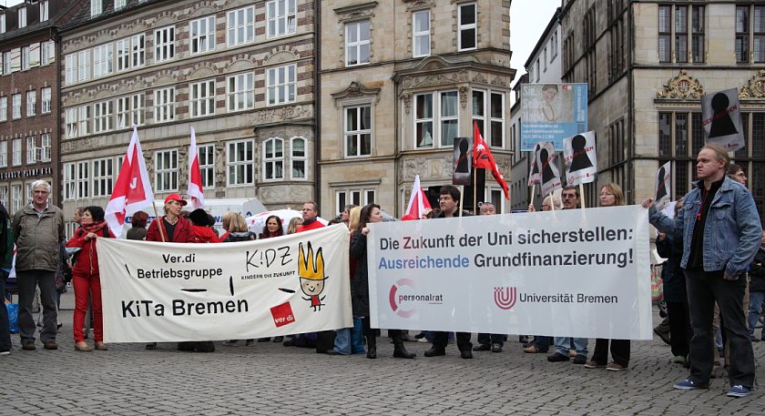 Ausgepresst und sauer - unter diesem Motto versammelten sich am 25.09.2013 mehr als eintausend Beschäftigte aus dem bremischen öffentlichen Dienst und Studierende vor der Bremischen Bürgerschaft. Sie protestierten gegen die neuerlichen Haushaltskürzungen, die jetzt vom Senat in die Bürgerschaft eingebracht wurden. Vorgesehen ist danach unter anderem, in den nächsten beiden Jahren nochmals fast 400 Stellen im öffentlichen Dienst abzubauen. Bereits vor den Sommerferien hatte die Bürgerschaft beschlossen, den Tarifabschluss für den öffentlichen Dienst nur zu einem geringen Teil auch auf die Beamtinnen und Beamten zu übertragen.
