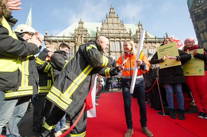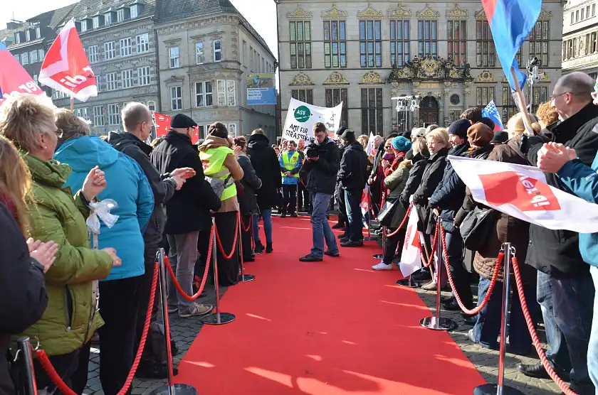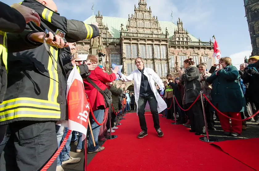 Sie machen einfach gute Arbeit, unter schwierigen Bedingungen, aber immer engagiert. Unsere "Stars des öffentlichen Dienstes" schritten am 18. Februar vor dem Rathaus über einen roten Teppich – begeistert begleitet und belagert von bewundernden Kolleginnen und Kollegen. Reinigungskräfte bei Immobilien Bremen, eine Landschaftsgärtnerin beim Umweltbetrieb Bremen, eine Verwaltungsangestellte in einer Bremer Schule, FeuerbeamtInnen, ein Justizvollzugsbeamter, eine technische Mitarbeiterin in der Universität Bremen, Auszubildende im Bremer AFZ, ein Straßenwärter, eine Diplom-Bauingenieurin, ein Referent vom SKJF (Senatorin für Soziales, Kinder, Jugend und Frauen), eine Sachbearbeiterin im AFSD (Amt für soziale Dienste), als auch Erzieherinnen bei KITA Bremen sowie ein Arbeitspädagoge bei Werkstatt Bremen – all diese Beschäftigten nutzen ihren Auftritt, um auf ihre Probleme und Forderungen für die Zukunft aufmerksam zu machen.